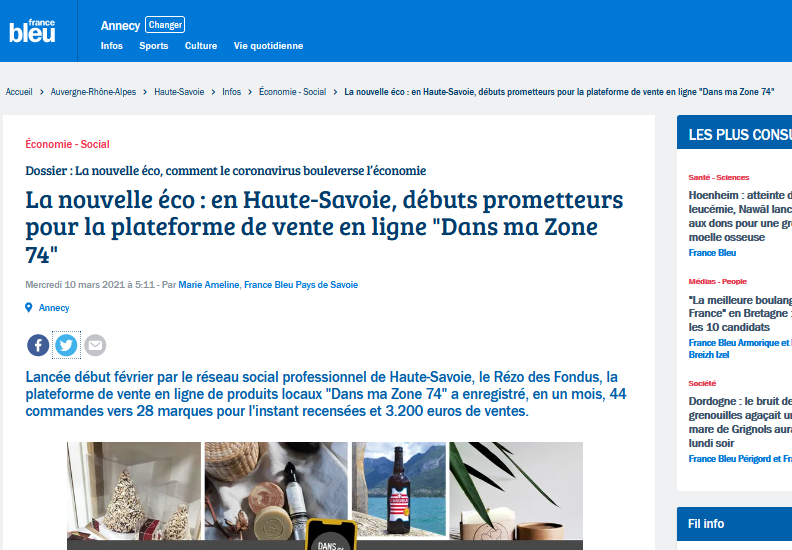 La nouvelle éco : en Haute-Savoie, débuts prometteurs pour “DANS ma ZONE 74” Les Fondus10 mars 2021Actualités Merci à Marie AMELINE et à France Bleu Pays de Savoie pour cette interview diffusée le 10 mars dans l’émission “La nouvelle éco”. A lire ici annecydans ma zonedans ma zone 74haute savoielivraisonplateformeproduits locauxproduits locaux 74rezo des fondusvente en ligne
